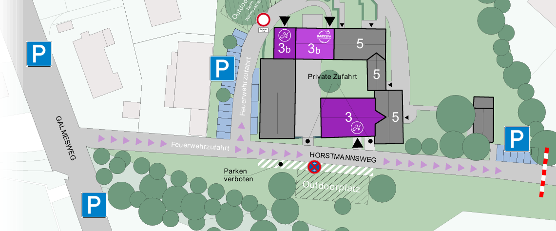 Am Horstmannshof gibt es Kundenparkplätze. Ebenso können Sie auf den öffentlichen Parkplätzen auf dem Galmesweg parken. Auf dem Horstmannsweg ist das Parken verboten.